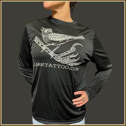 This is the first time we have done a shirt fabric like this one, so we had to go with our newest design for it, which is Lark’s little lark on a lark leg, created by our very own Neal Aultman.